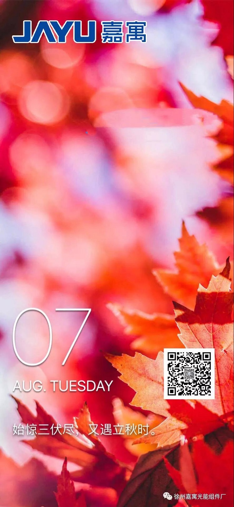 立秋,讓成熟的萬(wàn)物更加芬芳,讓豐華的人生更加華美。嘉寓光能期待大家在立秋之后的人生節(jié)氣里,能有一份秋的從容,秋的沉靜。