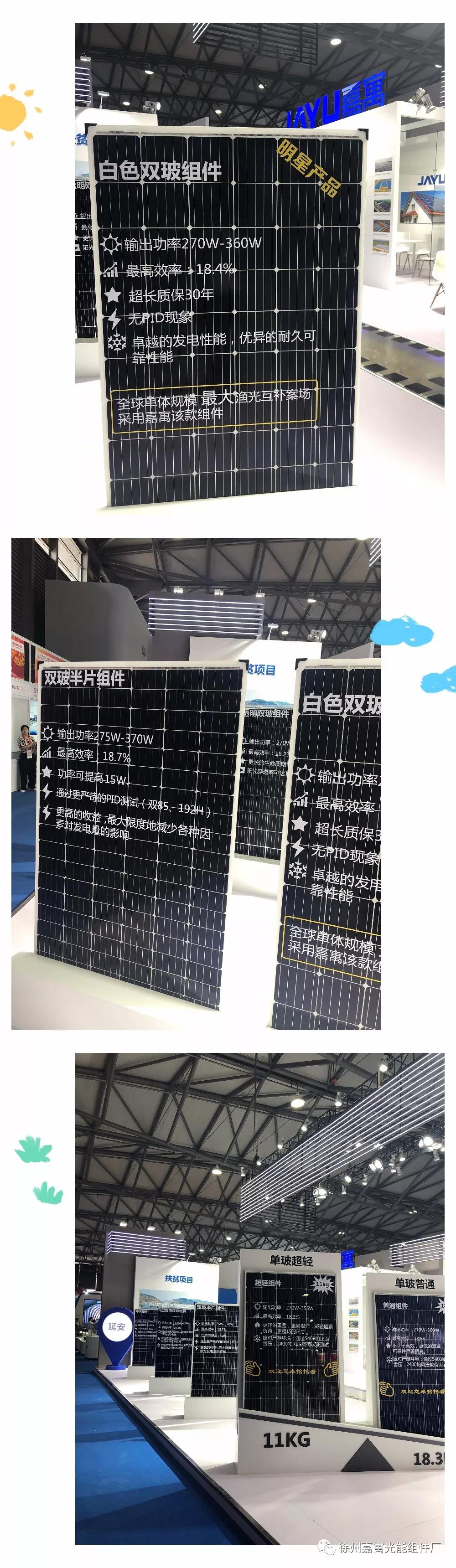 展品展示包括光伏組件、戶用光伏、光伏電站項(xiàng)目、扶貧項(xiàng)目展示區(qū)。今年嘉寓展臺(tái)一大亮點(diǎn)為白色雙玻組件產(chǎn)品,全球單體規(guī)模*大漁光互補(bǔ)案場采用嘉寓該款組件。該產(chǎn)品輸出功率270W-360W;*高效率18.4%;超長質(zhì)保30年;無PID現(xiàn)象;具備*越的發(fā)電性能,優(yōu)異的耐久可靠性能。