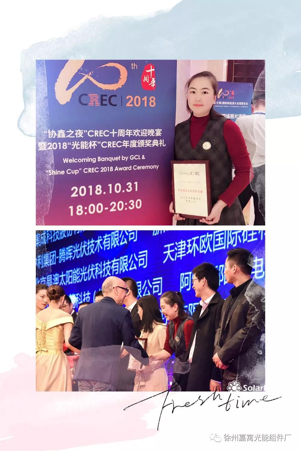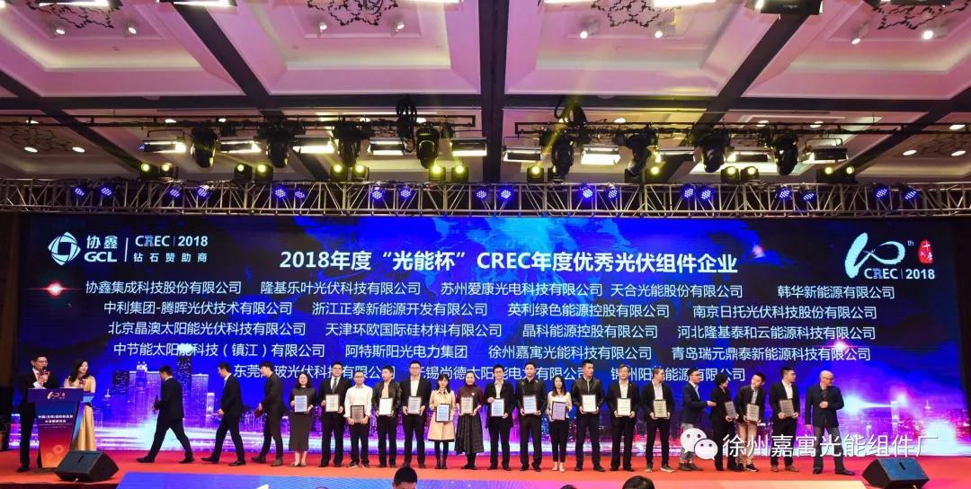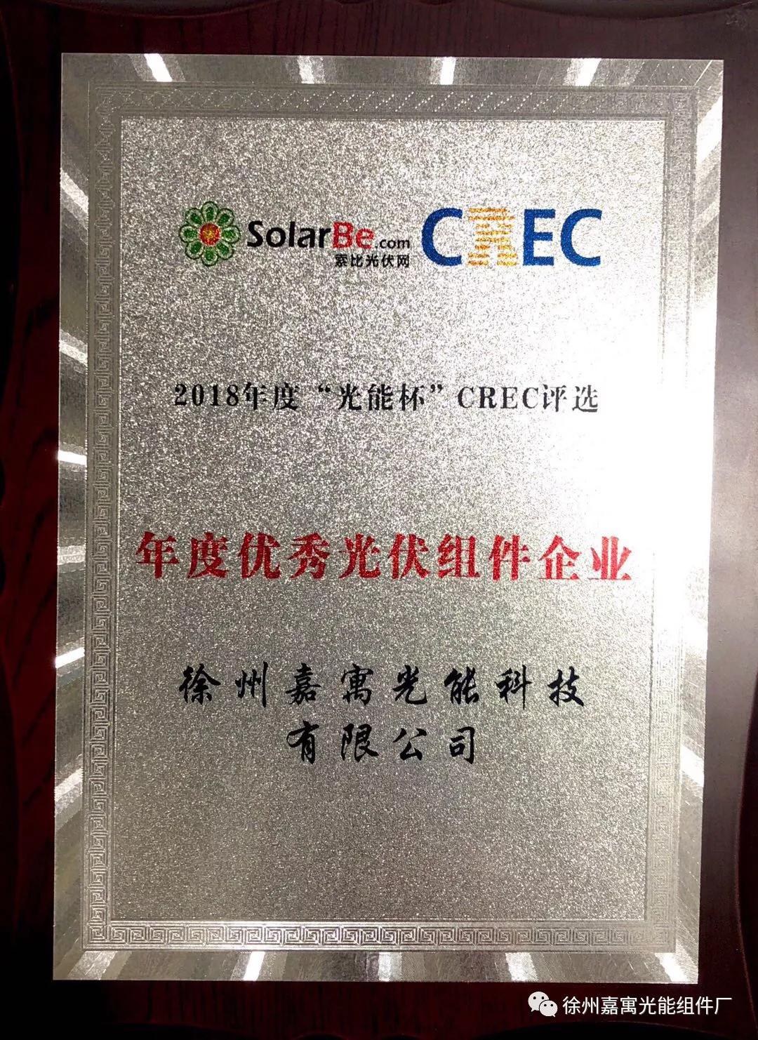 10月31日,由中國(guó)(無(wú)錫)國(guó)際新能源大會(huì)暨展覽會(huì)CREC、Solarbe索比光伏網(wǎng)、《光能》雜志共同主辦的2018CREC光能杯光伏行業(yè)頒獎(jiǎng)晚會(huì)盛大召開(kāi),徐州嘉寓光能榮獲“年度優(yōu)秀組件企業(yè)大獎(jiǎng)”。
