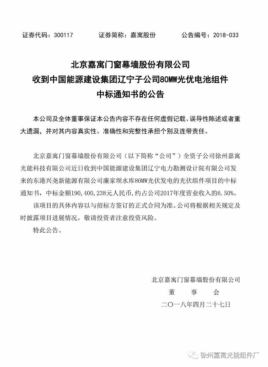 徐州嘉寓光能組件廠中標(biāo)中國(guó)能源建設(shè)集團(tuán)遼寧電力勘測(cè)設(shè)計(jì)院有限公司東港興堯新能源有限公司廉家壩水庫(kù)80MW光伏發(fā)電光伏組件項(xiàng)目