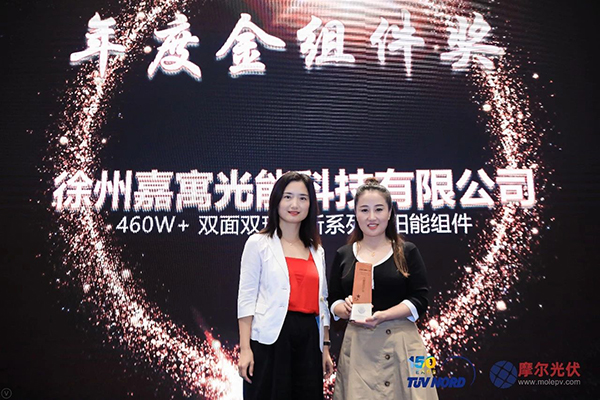 研討會議結(jié)束后,參會人士早就期待已久的“2019光伏風向獎頒獎典禮”在傍晚時分如約而至。本次頒獎典禮是由本屆雙面發(fā)電與平價上網(wǎng)技術(shù)路線研討會組委會組織,旨在鼓勵光伏企業(yè)在光伏行業(yè)技術(shù)進步中的創(chuàng)造性工作,促進光伏行業(yè)技術(shù)水平的提高,早日實現(xiàn)平價上網(wǎng),獎勵高水平的光伏企業(yè)及人物取得的技術(shù)成果。繼在2018年的頒獎典禮獲得“卓效品質(zhì)獎”之后,嘉寓光能在本屆2019光伏風向獎頒獎典禮上更進一步,一舉摘得“金組件”大獎。