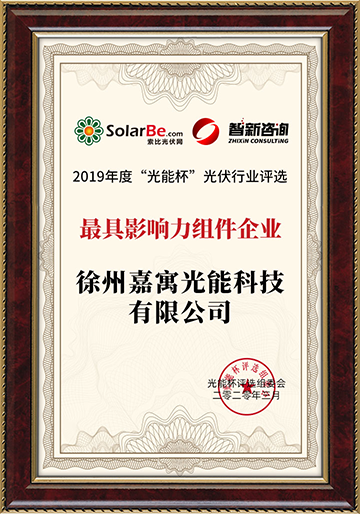 3月31日下午,由索比光伏網(wǎng)主辦的2019年度“光能杯”評選活動(dòng)暨光伏行業(yè)首個(gè)直播頒獎(jiǎng)典禮成功舉辦,此次線上直播受到了行業(yè)內(nèi)外的高度關(guān)注,徐州嘉寓光能科技有限公司在200多家報(bào)名企業(yè)中憑借強(qiáng)大創(chuàng)新力、出色的品質(zhì)與服務(wù)、卓越的品牌影響力,擷取了光伏行業(yè)評選"2019年度最具影響力組件企業(yè)"大獎(jiǎng)。