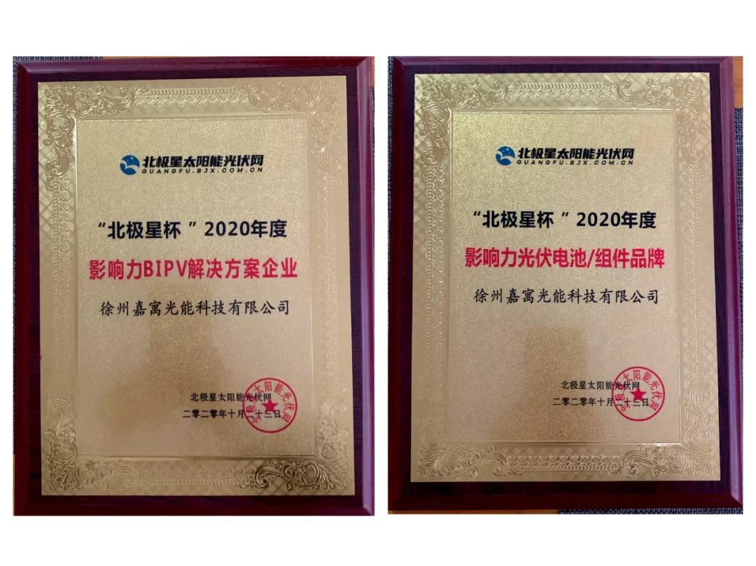 2020年10月23日,“北極星杯”2020光伏影響力品牌評(píng)選活動(dòng)在北京西國(guó)貿(mào)大酒店隆重舉行,嘉寓光能再次榮膺“2020影響力組件品牌”及“2020年度影響力 BIPV解決方案企業(yè)”兩個(gè)稱號(hào)。